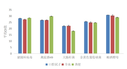 将大肠杆菌、金黄色葡萄球菌、酿酒酵母和猪圆环病毒、禽流感H9疫苗稀释液添加至口腔拭子、全血、粪便样本中,按照新百基微生物核酸提取试剂盒的流程进行提取,提取产物通过荧光定量PCR进行核酸定量。